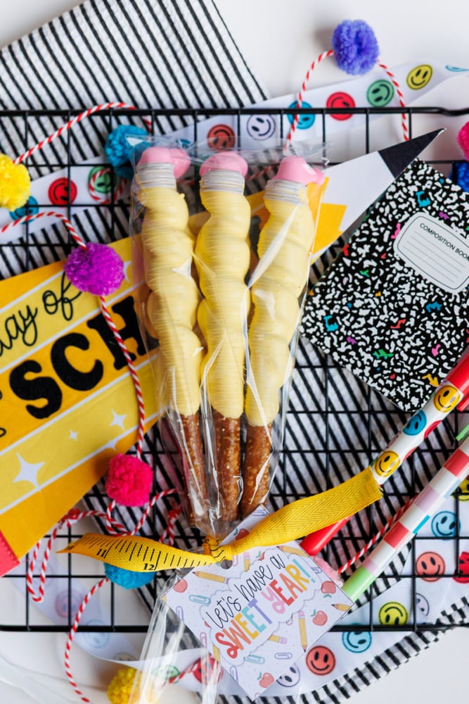 3 Pencil Pretzees combined into one cellophane bag and tied with ribbon. Gift tag attached. Please select your tag