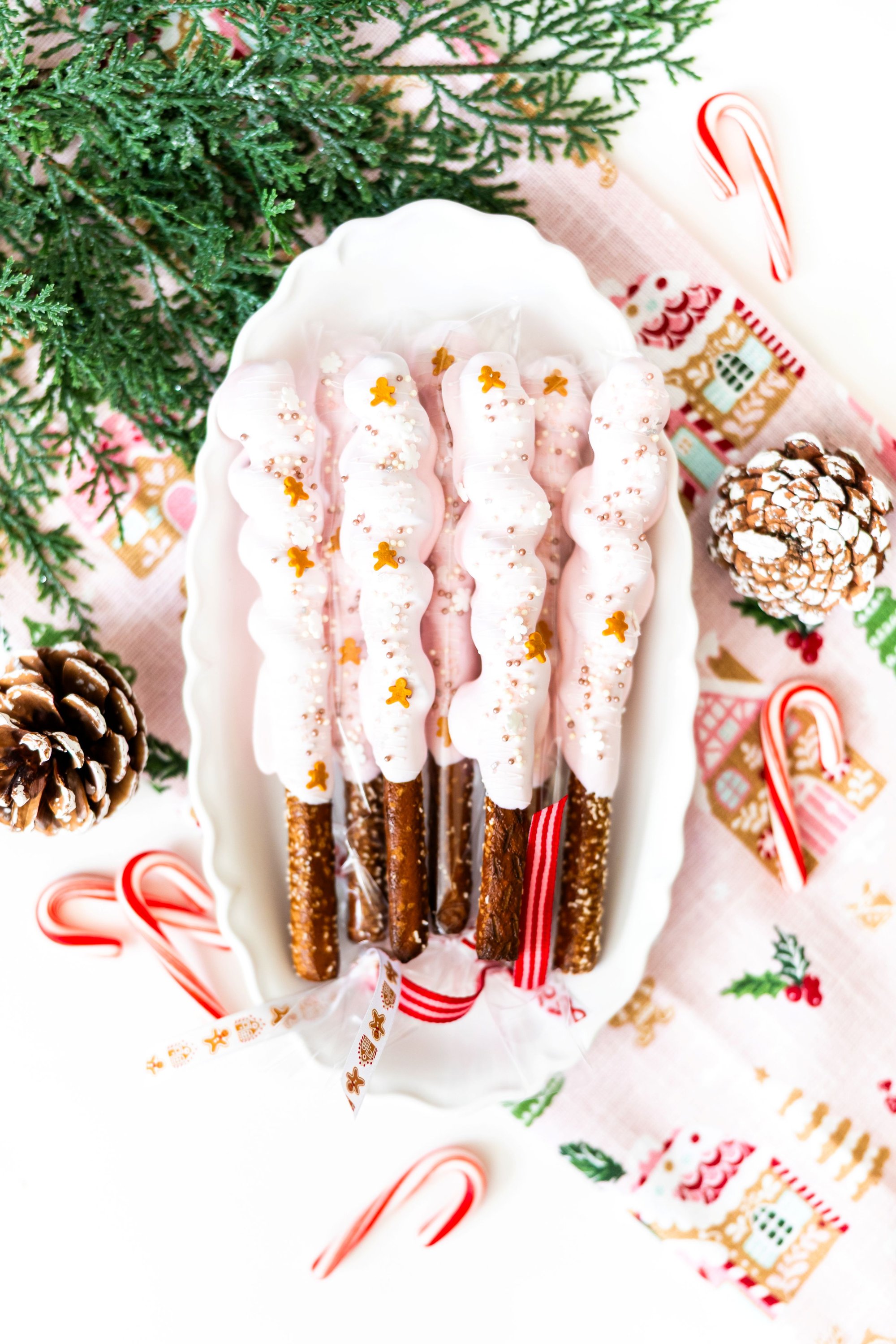 One dozen (12) blushing pink dipped Prezees decorated with snowflakes and gingerbread sprinkles. Each pretzel is individually packaged with ribbon. Your selection of chocolate dip.