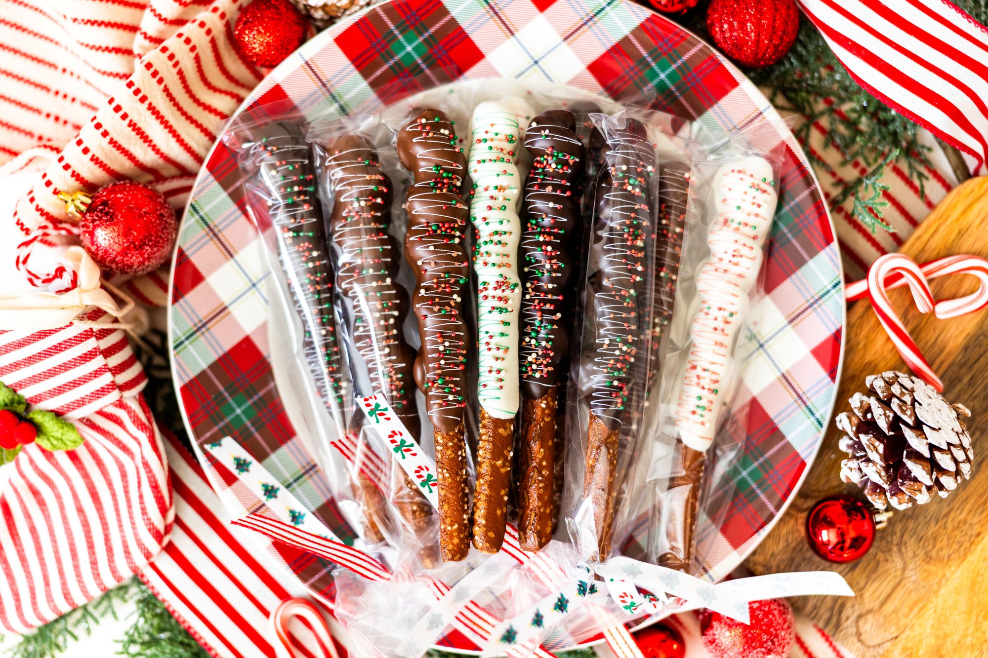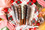 50 classic Pretzees - perfect for a large party! Each pretzel is sprinkled and drizzled with holiday colors and individually packaged with ribbon.