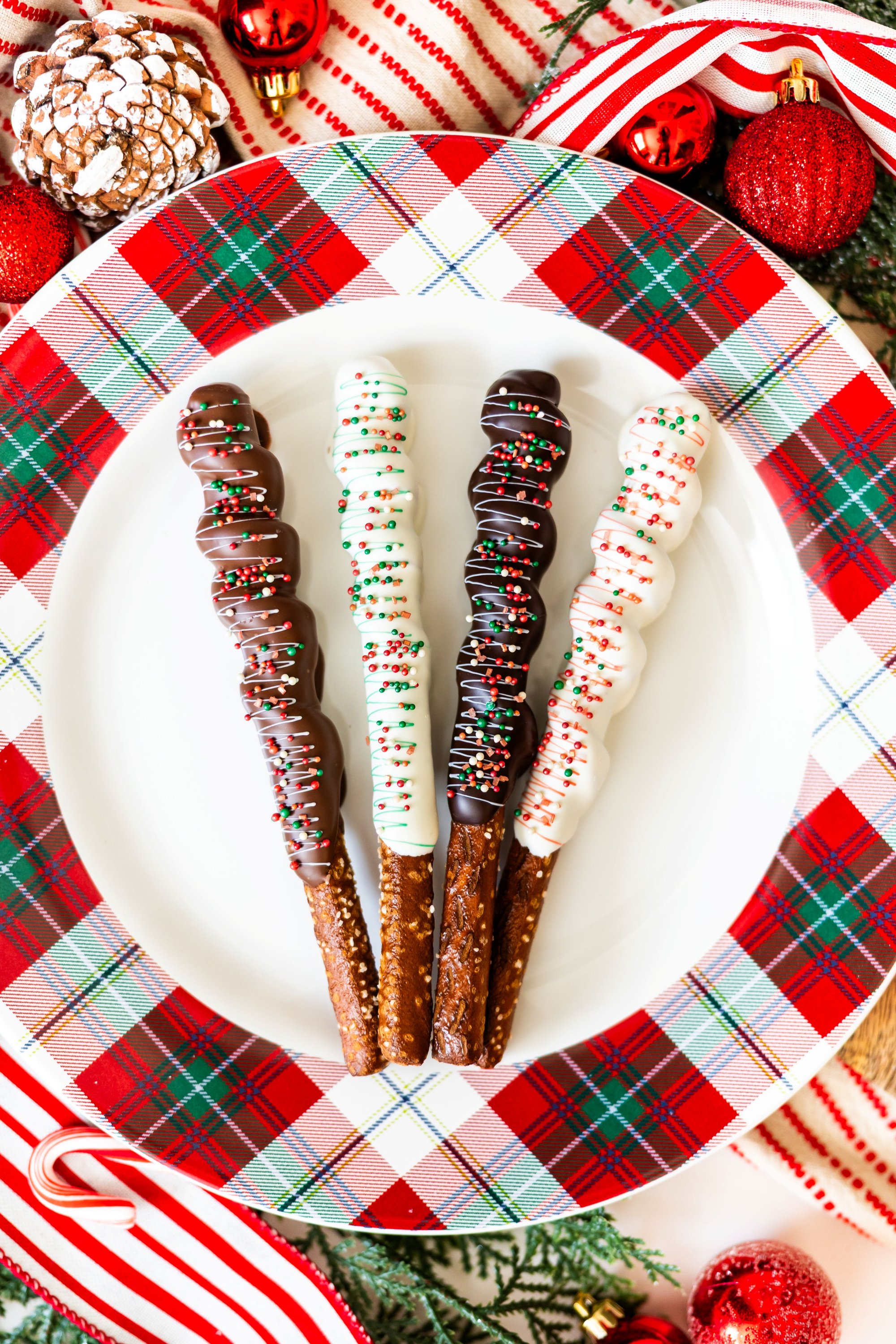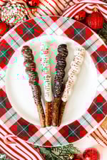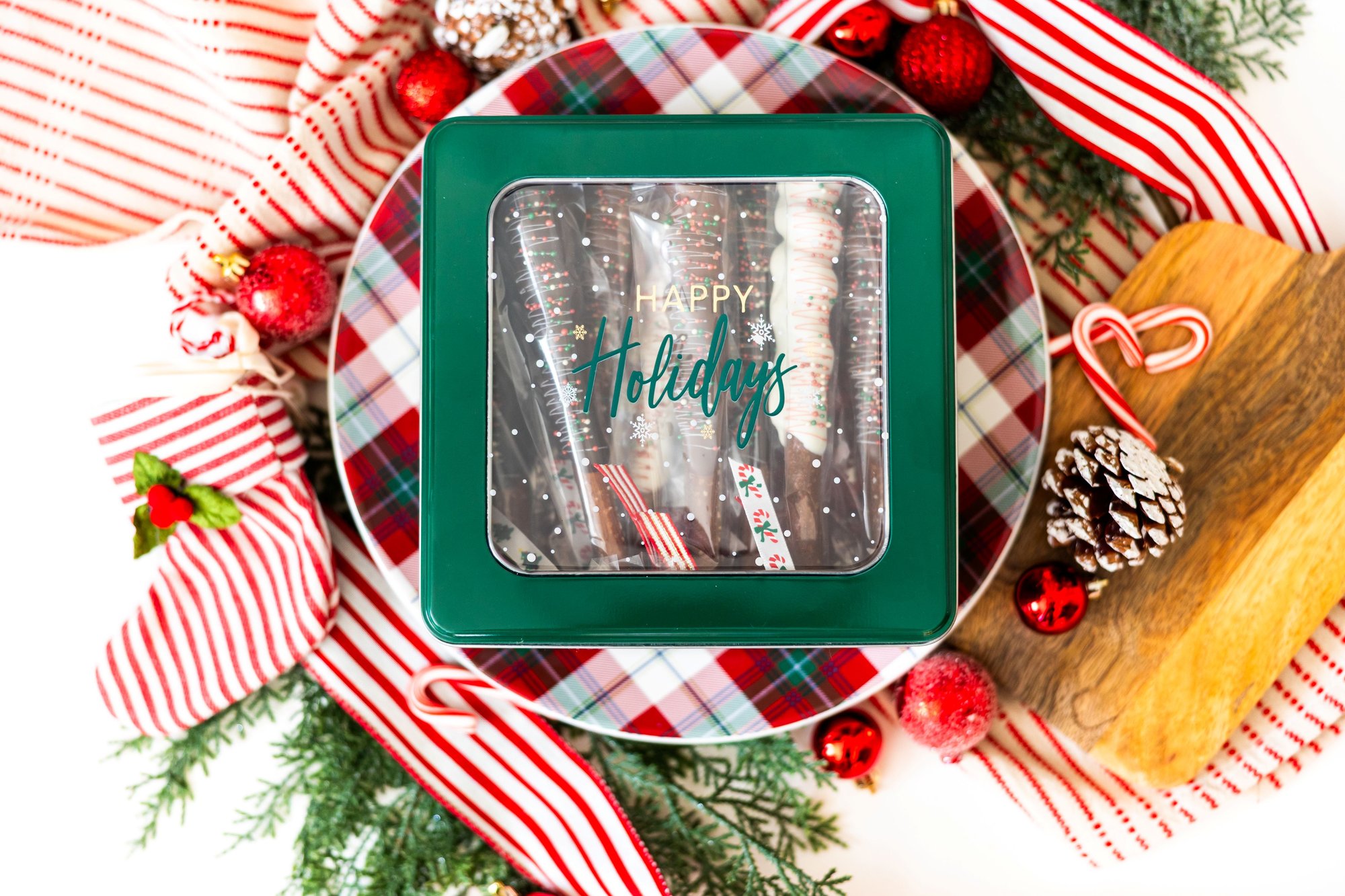 One dozen (12) caramel wrapped chocolate dipped pretzels presnted in a classy gift tin. Each pretzel is sprinkled and drizzled with holiday colors and individually packaged with ribbon. Perfect for business clients.