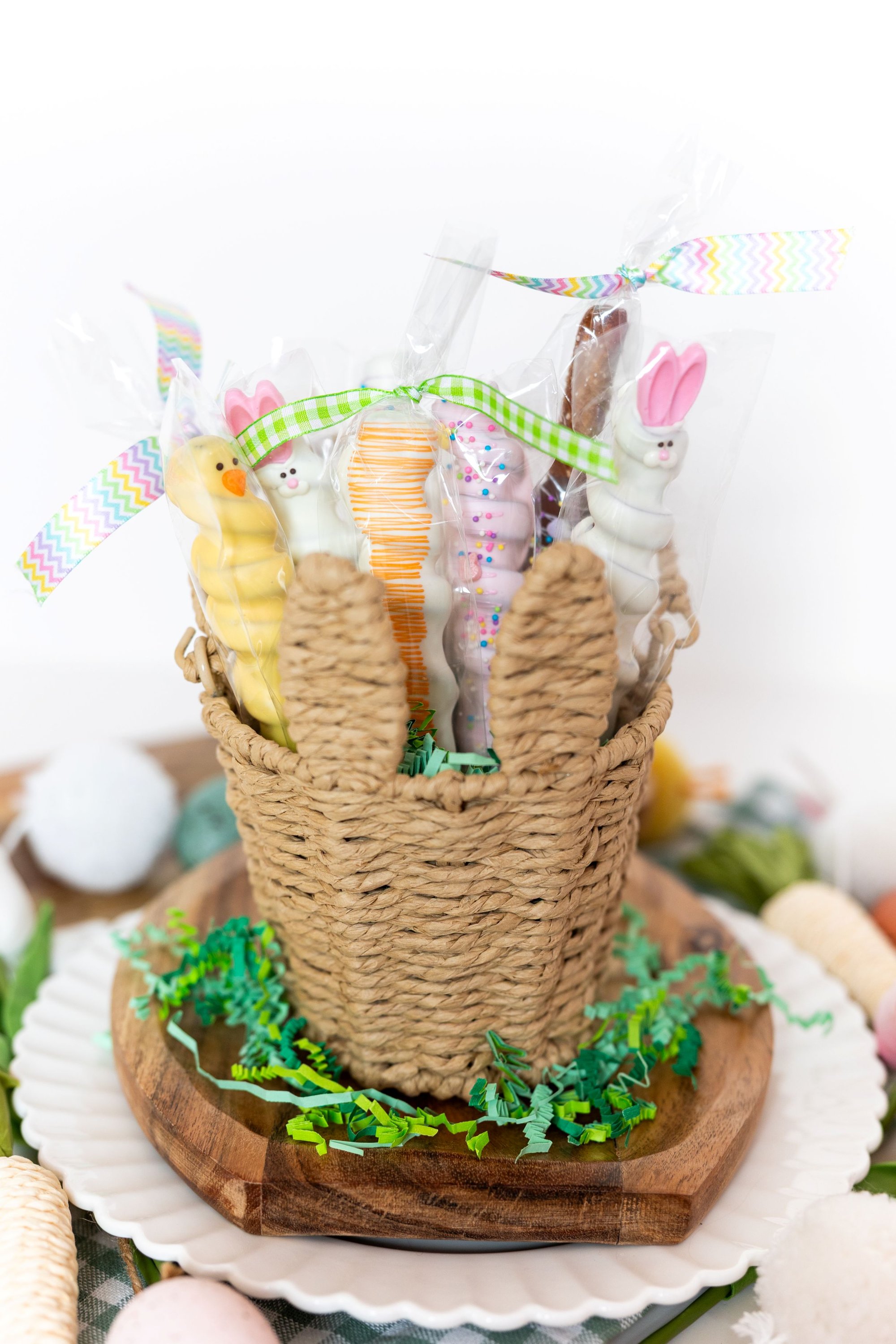 Two Dozen (24) assortment box. 1/2 classics 1/2 decorated as bunnies, carrots, and chicks. Each Pretzee is individually packaged and tied with ribbon.